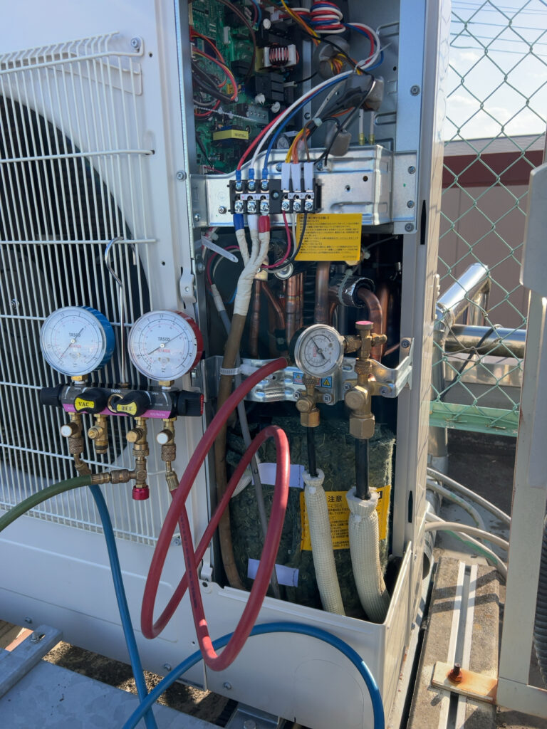 気密試験で業務用エアコンの配管経路に漏れがないかチェックです