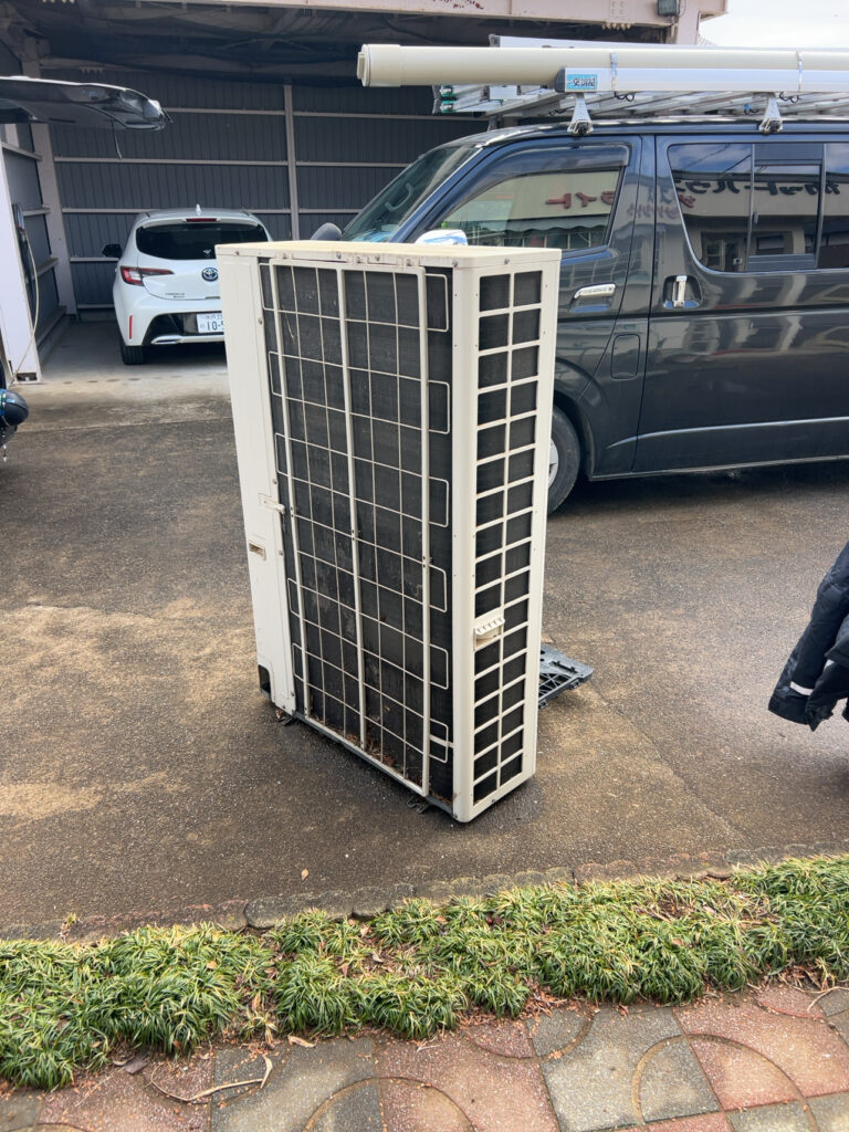 古いエアコンの取替工事です、見るからに古めかしいですね。